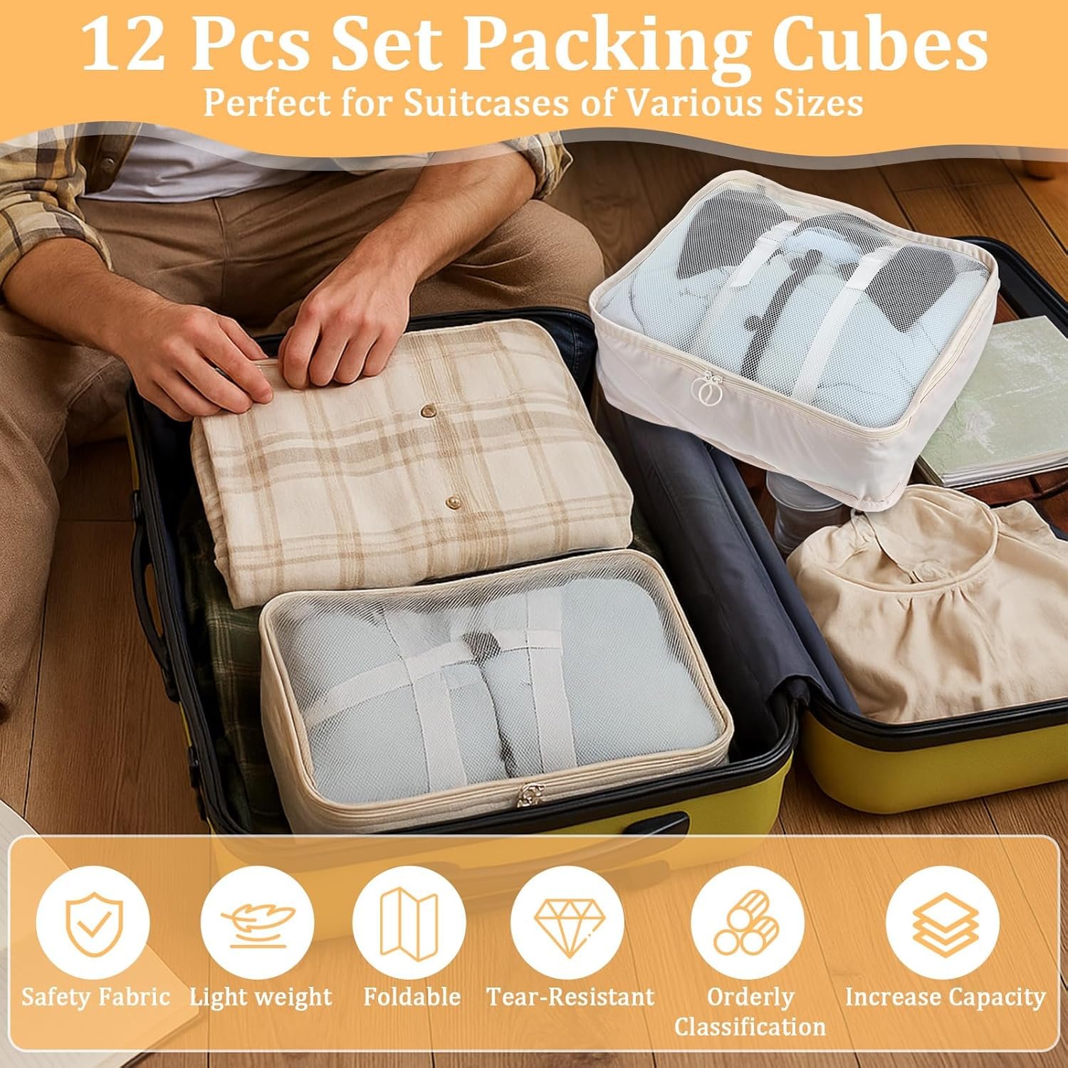 12 Pcs Packing Cubes for Suitcase Travel Luggage Bags Bulk Mesh Organizer Set for Hiking Camping Backpacking Clothes Accessories(Light Khaki, S, M, L Size)