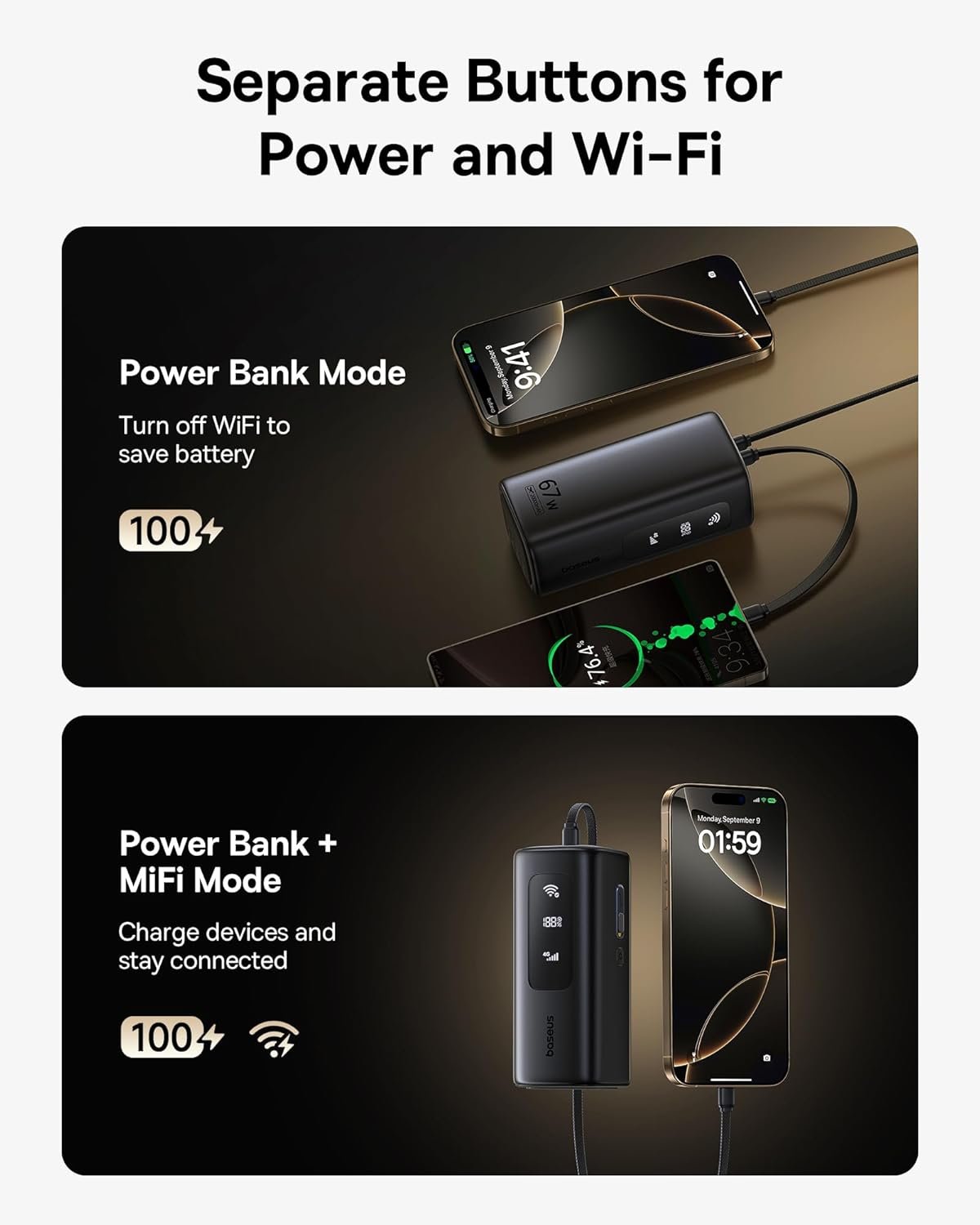 🔋【All-in-One Portable Hotspot & Power Bank】Never run out of battery again! With a massive 20,000mAh built-in battery, enjoy up to 114 hours of Wi-Fi hotspot use. Plus, recharge your devices on the go with 67W USB-C fast charging. Your ultimate travel companion.
