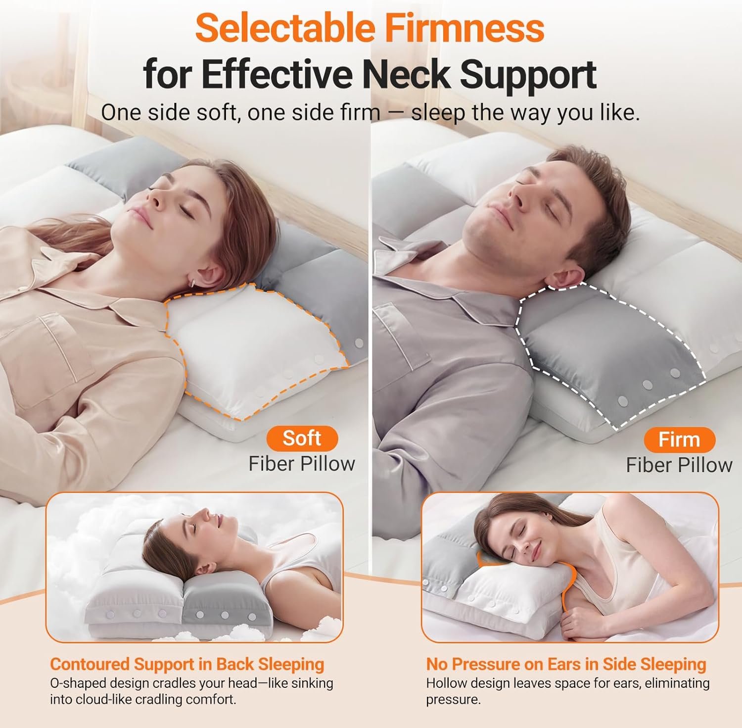Selectable Firmness for Effective Neck Support: The upper layer of this cervical neck pillow features two silk floss pillows with different firmness, providing customizable comfort options with a softer or firmer feel. When lying down, the firmer gray side is about 4.3″ high, while the softer white side is about 3.5″, providing two height options. Additionally, the silk floss pillows align with your neck contour to ensure stable and precise support for restful sleep, no matter how you move