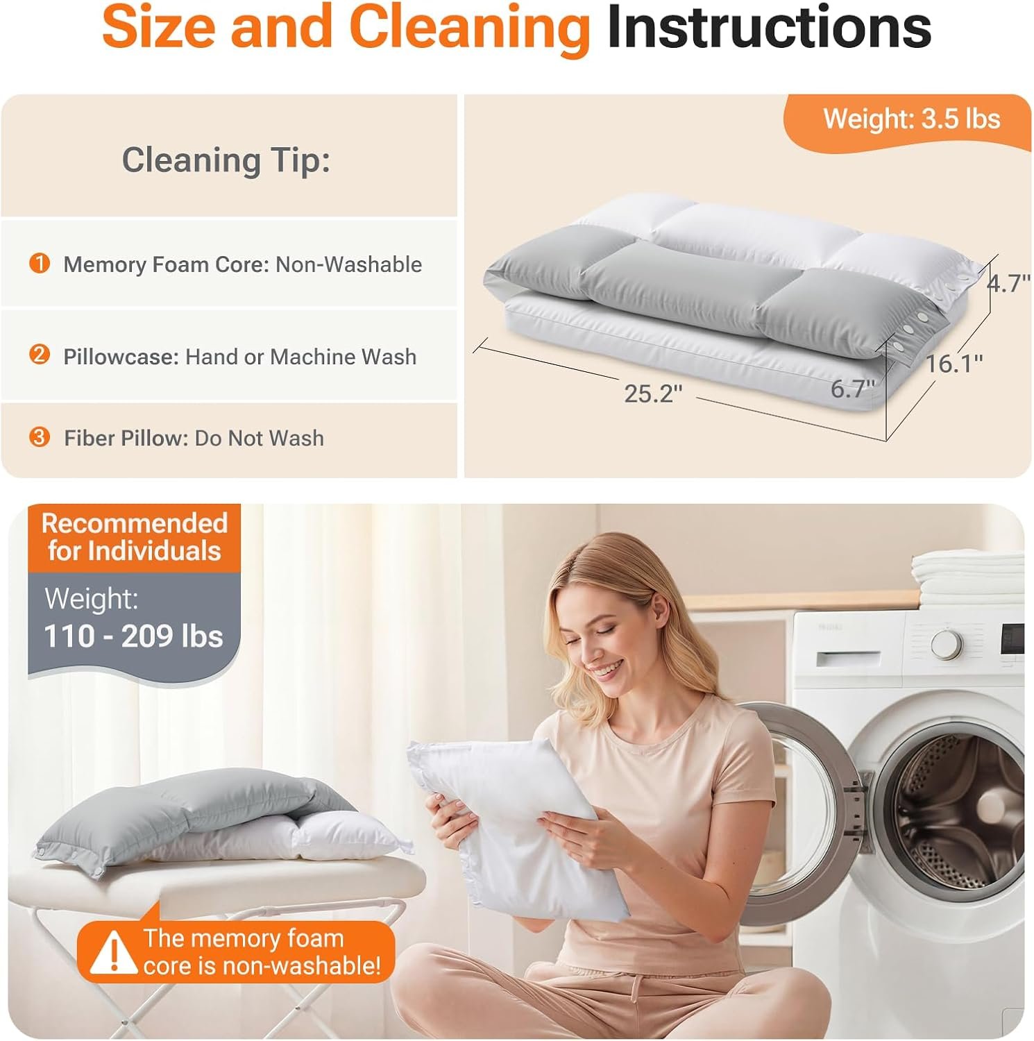 Size and Cleaning Instructions: Measuring 25.2″ (L) × 16.1″ (W) × 4.7″/6.7″ (H), this contour pillow is recommended for people weighing 110 to 209 lbs (support performance may vary beyond the range). For cleaning, open the snap buttons to remove the upper silk floss pillows (Do not wash silk floss pillows for optimal comfort); unzip and remove the pillowcase of the memory foam pillow; hand or machine-wash the pillowcase on a gentle cycle with cold water. Note: The memory foam must not be washed