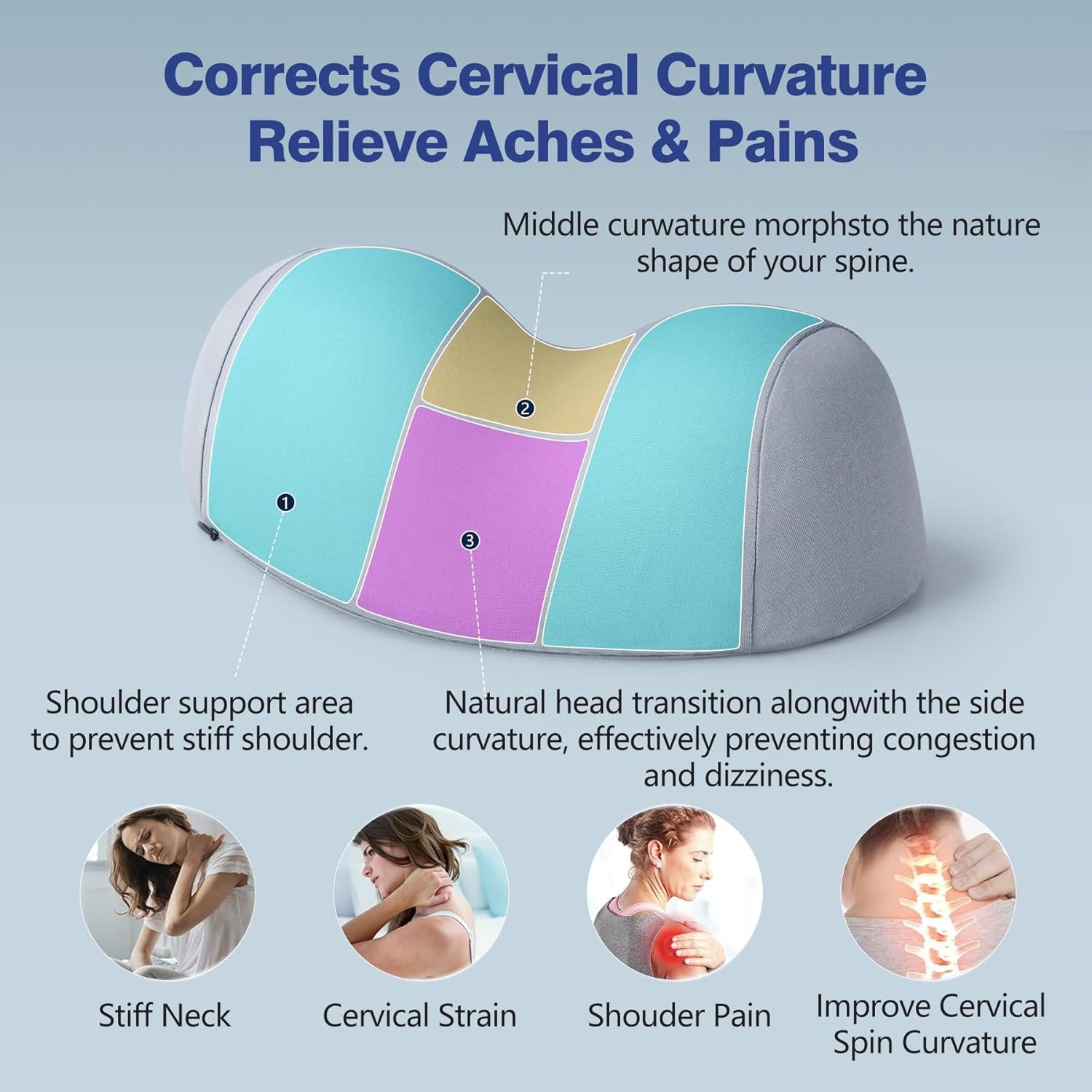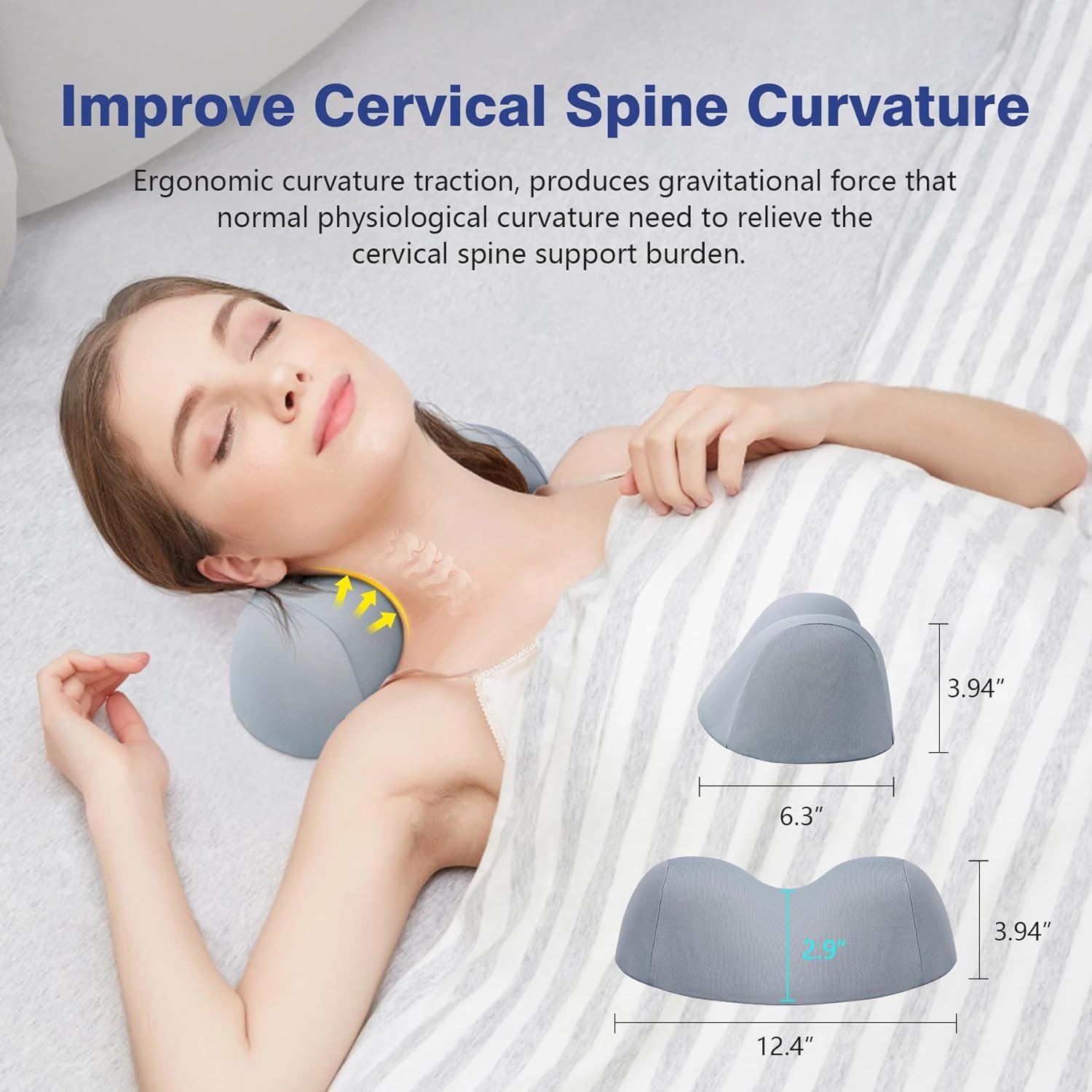 ERGONOMIC NECK TRACTION PILLOW – The cervical contour design perfectly aligns your head, neck, shoulder, and back, neck support pillow give you good support and reduces the stress in the cervical vertebra and spine, thus effectively relief muscle tension. Perfect curvature helps the vertebrae stay relaxed, keeps neck and shoulders aligned, and maintains the natural curvature of the spine, so the neck traction pillow can be used as a posture pillow to adjust cervical curvature.