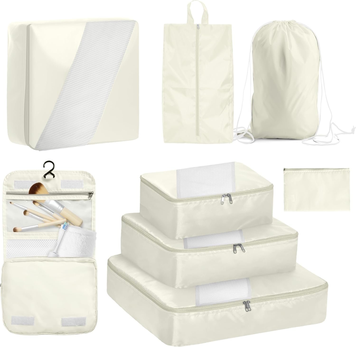 9 Packing cubes Set: Compression packing cubes have 3 sizes to meet all your luggage storage needs, including M, L, XL travel compression organizer bag. The XL compression cubes hold jackets, coats, sweaters. The L packing cubes hold shirt, long sleeves, denim. The M packing cube holds T-shirts and other lightweight clothing. Also includes 1 x Underwear bag; 1 x shoe bag; 1 x portable hanging Makeup bag; 1 x dirty clothes bag; 1 x small utility bag and 1 x clear waterproof liquid bags.