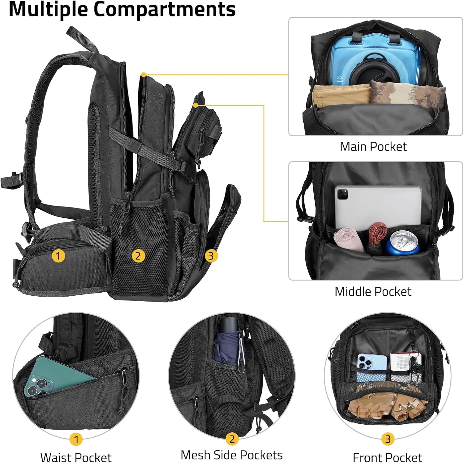 Multiple Pockets and Compartments: Our 3L hydration backpack has 6 zipper pockets, and the mesh compartment inside the backpack allows you to easily separate and organize items. The main pocket can store a 15-inch laptop. Your helmet can be stored in the center clip-on layer, and extra water bottles or umbrellas can be placed in the mesh pockets on the sides for easy access. Waistband pockets measuring 7 x 4 inches on both sides provide easy access to cell phones, keys, snacks, and more.