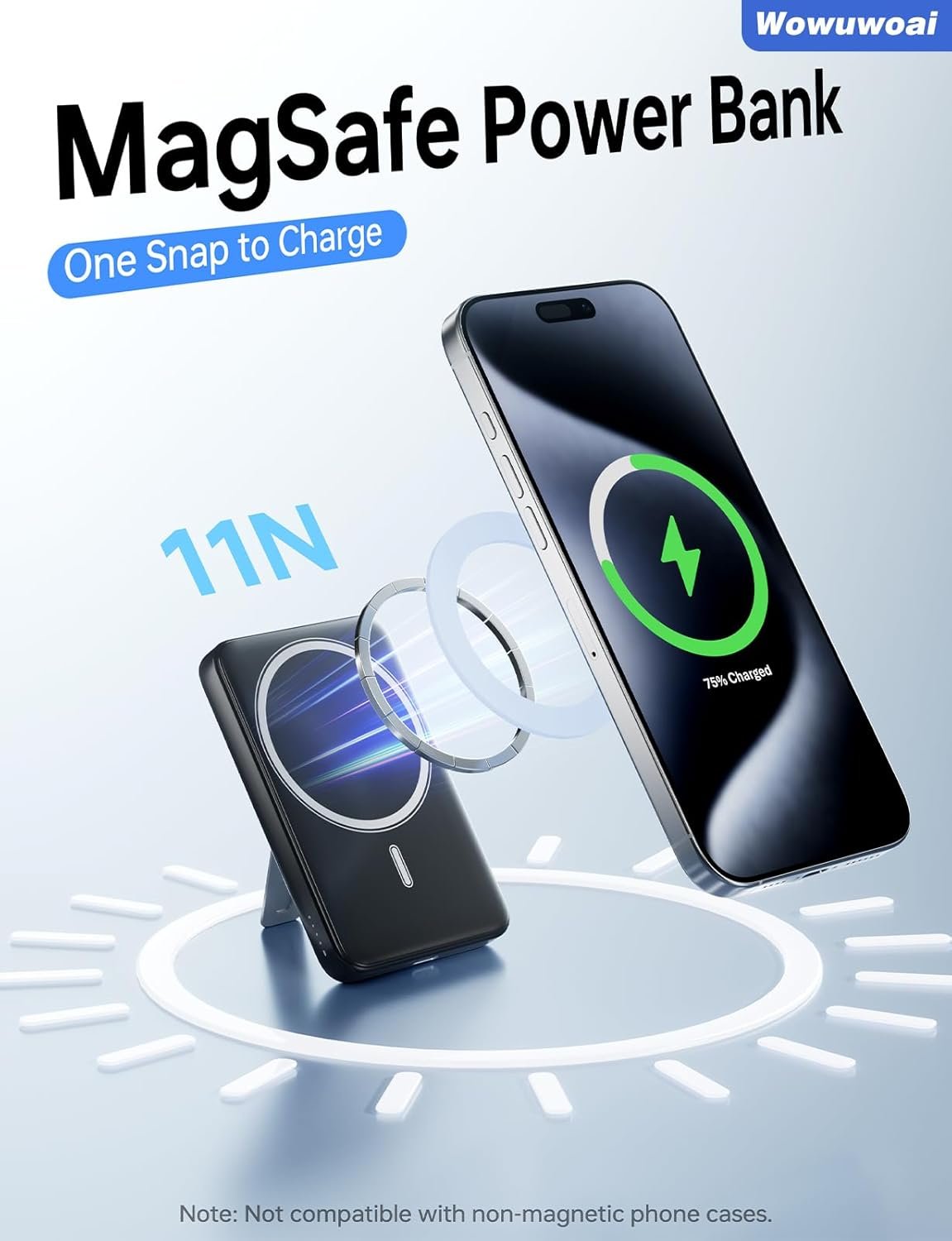 Designed for MagSafe & Magnetic-compatible Phones: this powerbank is compatible with iPhone 16/16 Plus/16 Pro/16 Pro Max, with iPhone 15/15 Plus/15 Pro/15 Pro Max, with iPhone 14/14 Plus/14 Pro/14 Pro Max, with iPhone 13/13 Mini/13 Pro/13 Pro Max, with iPhone 12/12 Mini/12 Pro/12 Pro Max , as well as other Android phones that support wireless charging. It can be used with the phone itself or paired with an official magnetic phone case. (Not compatible with non-magnetic phone cases.)