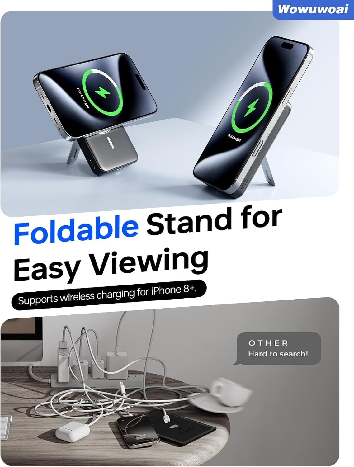 Smart LED & Built-in Kickstand for Convenience: See your power & enjoy hands-free! The intuitive 5-LED is your battery life coach—glance to know exactly when to recharge. Flip out the sturdy kickstand: Instantly create a mini workstation on your cramped airplane tray or prop it up for bedtime Netflix binges. Charge wirelessly while video calling Grandma or watching movies—totally hands-free battery pack!