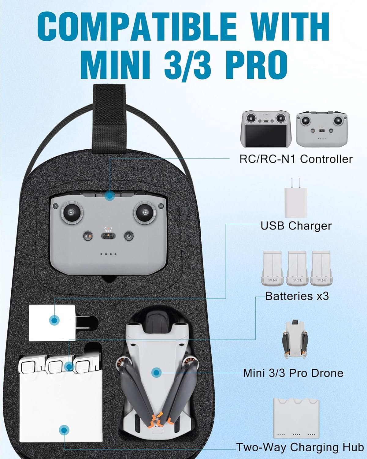 COMPATIBLE WITH DJI MINI 4 PRO/MINI 3/PRO: The shape of this Mini 4 Pro case features a sleek, 3D diamond-cut design that reflects a modern, tech-forward look. Custom-cut foam inserts for device locations are perfectly sized to fit DJI Mini 4 Pro/Mini 3/Pro drone, DJI RC 2/RC/N3/N2/N1 Controller, Two-Way Charging Hub, 3 Batteries, USB Charger and Cables. Plus, the Mini 3/4 Pro bag offers a mesh pocket to place Propellers, Screwdriver and other Fly More Combo accessories.