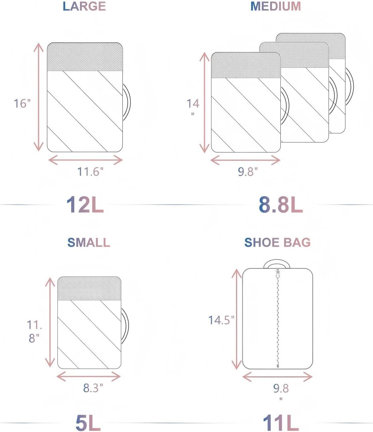 6-Piece Set: 1 Large (16″×11.6″×4″), 3 Medium (14″×9.8″×4″), 1 Small (11.8″×8.3″×3.1″), and 1 Shoe Bag (9.8″×14.5″). It keeps your suitcase or drawer neat and accessible