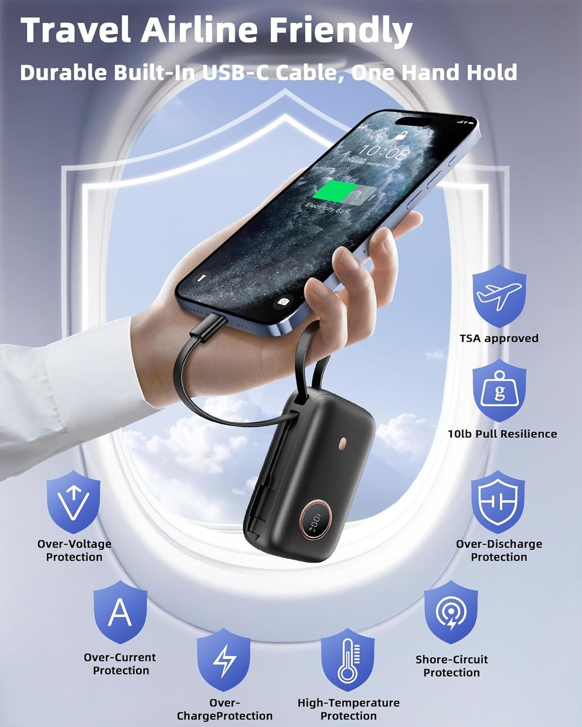 ✨[Extremely Compact] -This built-in USB-C cable power bank measures only 3.43*2.42 inch/ 87mm x 62mm, small as Palm, about half the size of a smartphone. Weighing 192g, it’s as light as the new iPhone 16 Pro, fitting easily into any pocket or backpack via one hand hold, easily go with boarding any plane for travel trip daily use