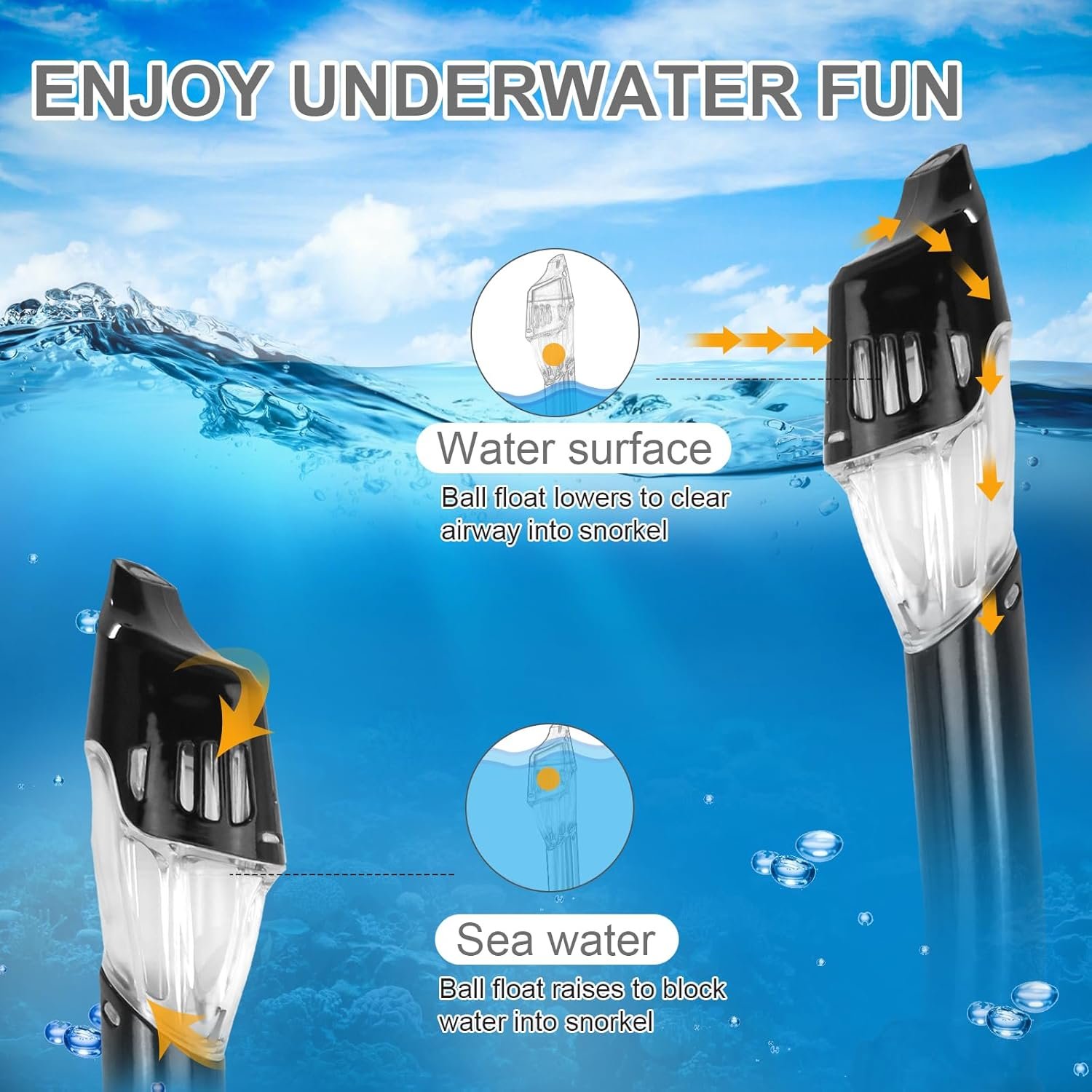 【Dry Top Snorkel for Unobstructed Breathing】The feature of the dry top snorkel is that there is a splash guard on the top of the snorkel, and when diving, the valve will automatically close to prevent water from entering and keep the snorkel dry.