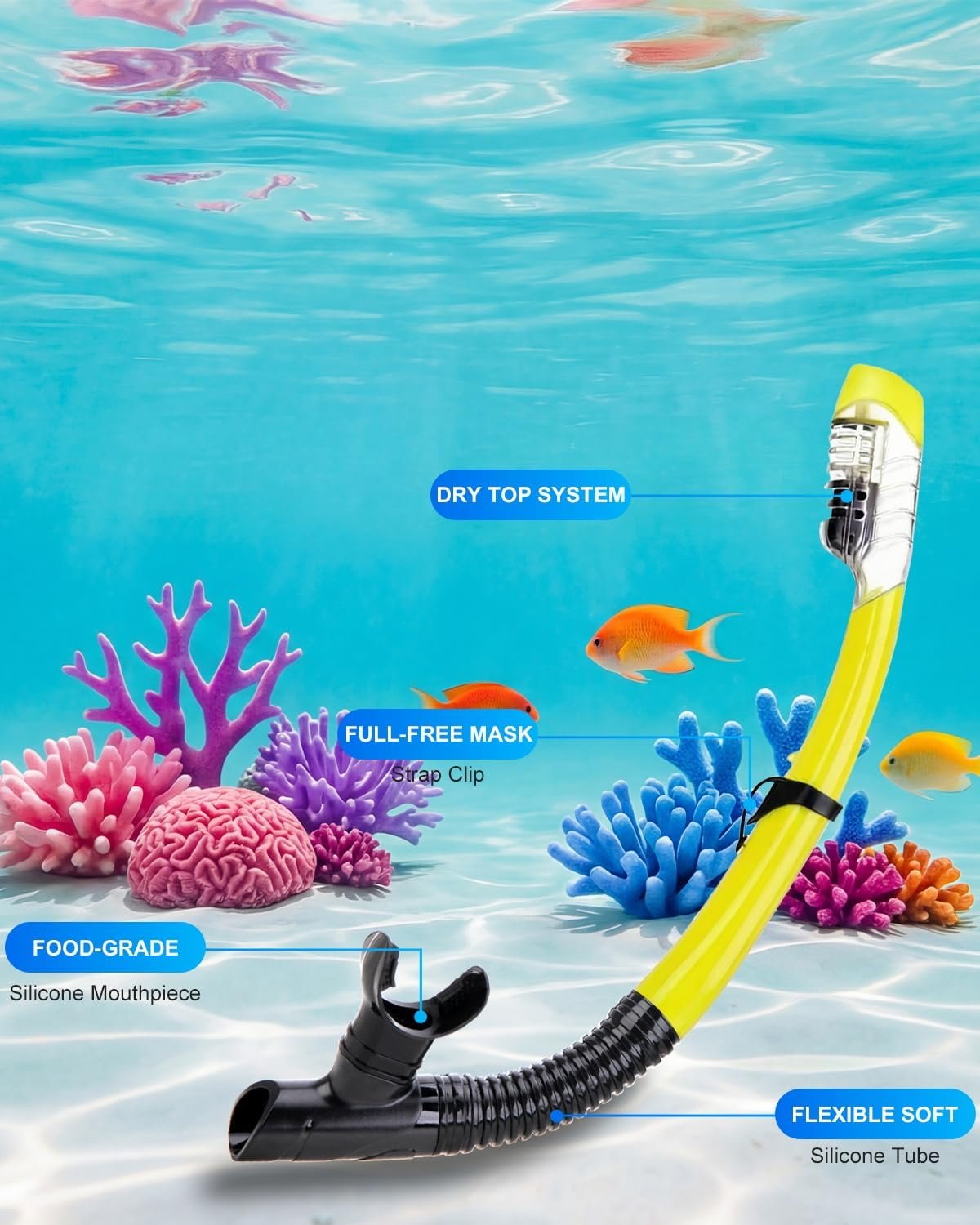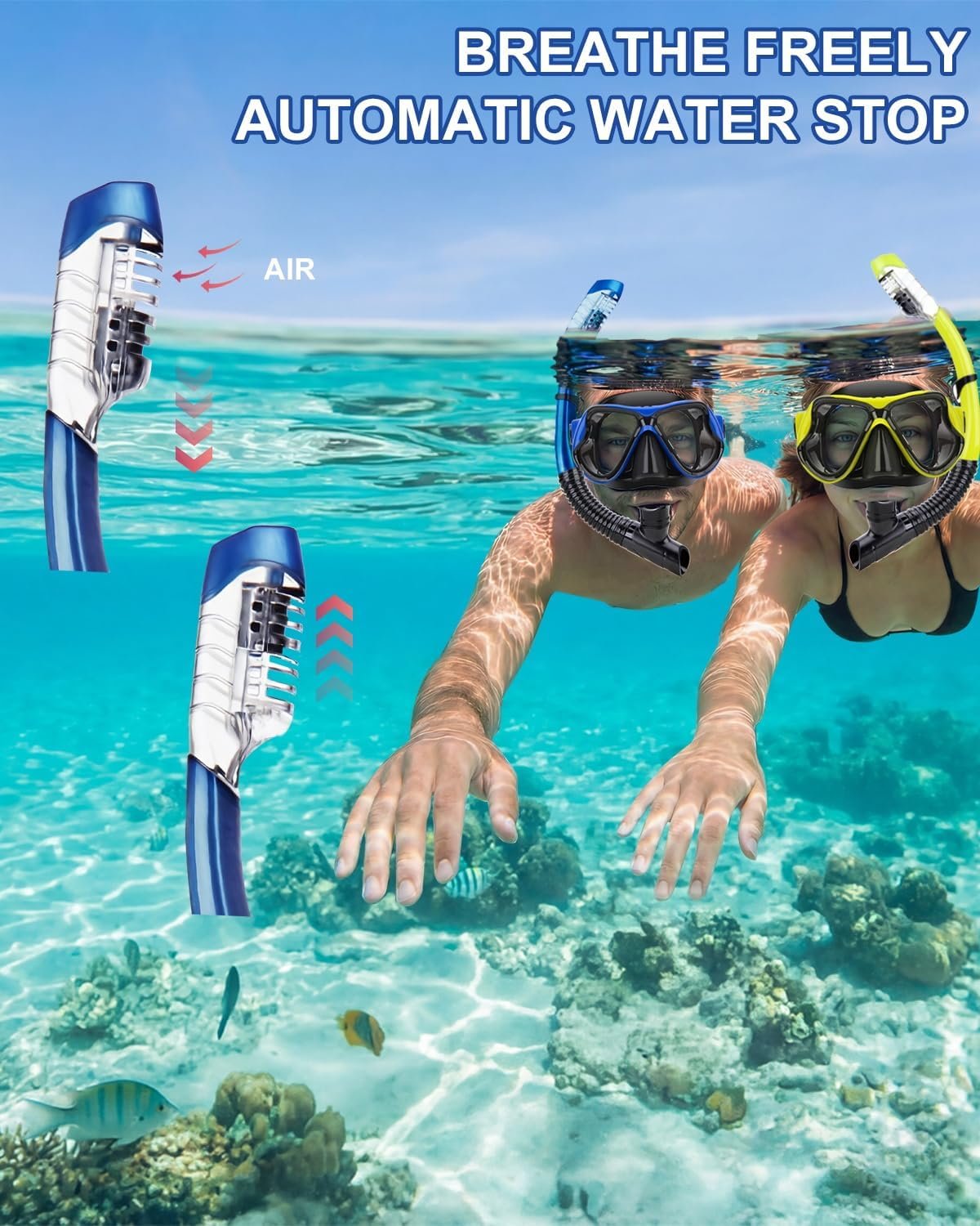Dry Snorkel with Drain Valve:This advanced dry snorkle set has a top-mounted automatic valve that blocks water entry. The valve closes instantly when submerged and reopens on surfacing. A splash guard keeps water out even if waves wash over your head. Unlike jam-prone float-type valves, our valve resists clogging from sand and debris. Plus, the bottom one-way drain valve enables fast water discharge.