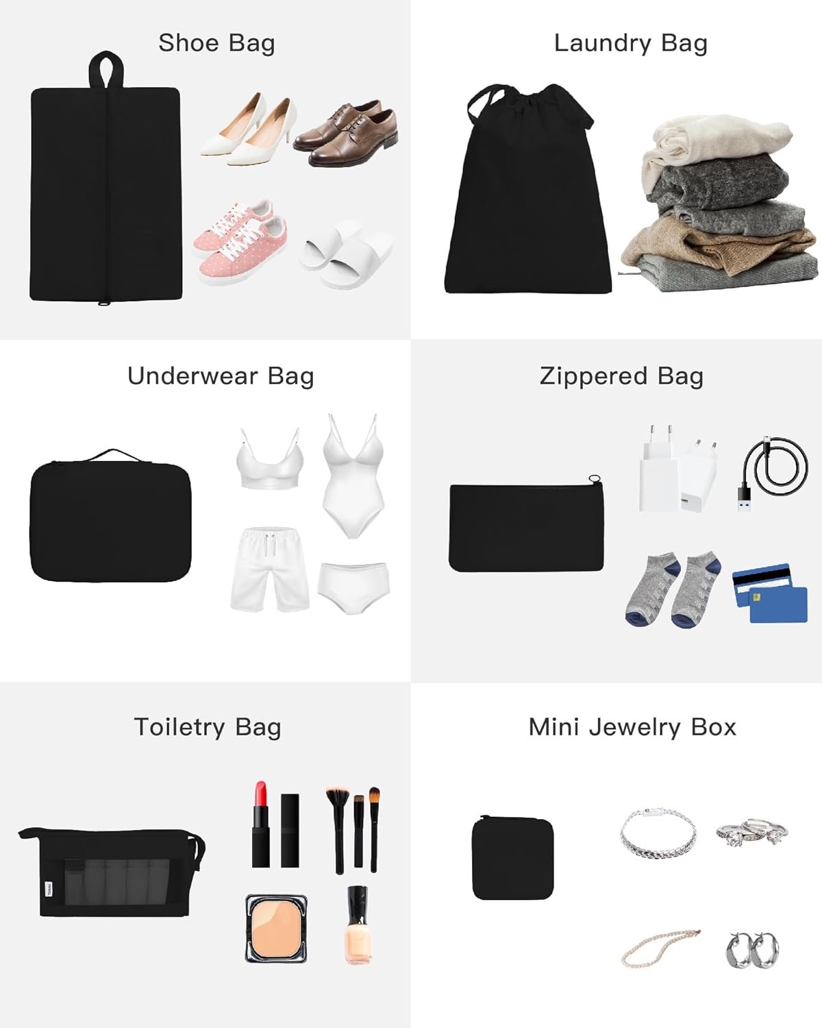 【8+1 ORGANIZATION SET】Eight-piece travel set. A mini jewelry box is included, which can store earrings, ear studs, rings, and other jewelry. The eight-piece set can be used to organize clothes, underwear, shoes and socks, cosmetics, dirty clothes, electronic accessories, and other items. Easily sort and organize travel essentials.
