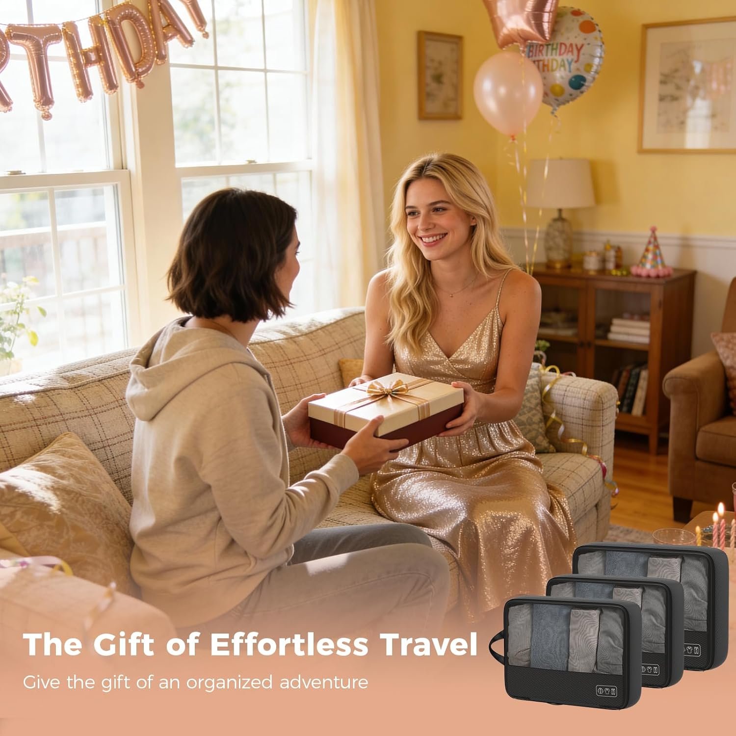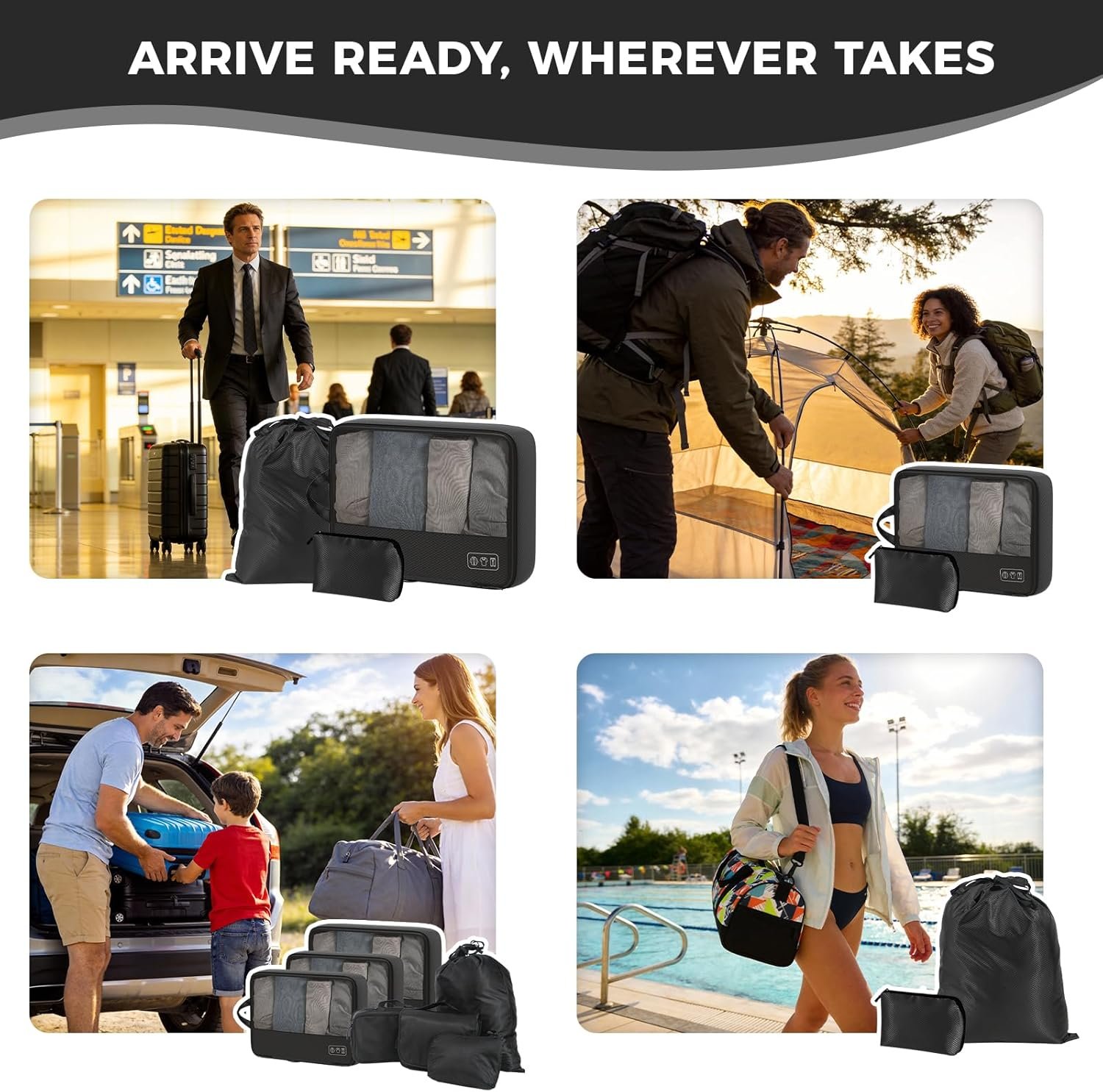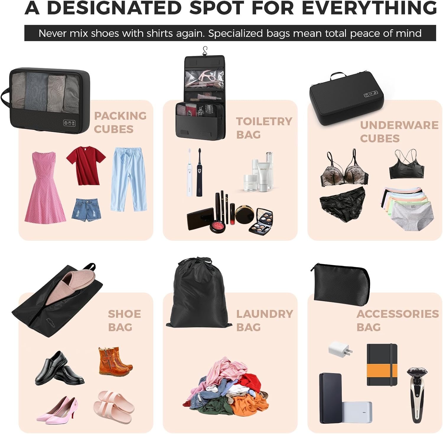 You will receive a complete travel organization system: 4 compression packing cubes (in large and medium sizes), a dedicated shoe bag, a water-resistant toiletry bag, a tech organizer pouch for cables and gadgets, and a laundry clothes bag.