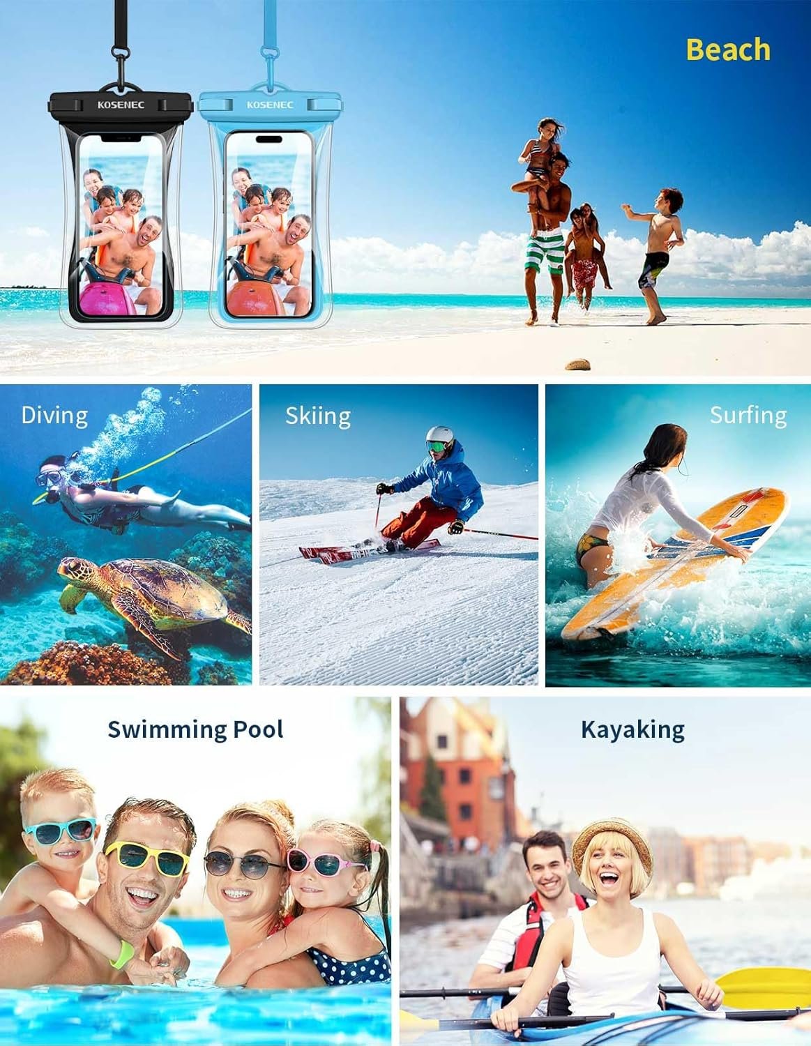 TRAVEL ESSENTIALS-SUPERIOR WATERPROOF PROTECTION – 100 feet/30 meters Certified IPX8 floating waterproof phone pouch is perfect for kayak, swimming pools, beach, fishing, surfing, sailing, skiing, boating, snorkeling, tubing, rafting, showering, sauna, other water park activities and to store your ID; This floatable waterproof phone pouch will keep your phone full functional and 100% protected from water/sand/snow/dust/dirt making it one of the best cruise, vacation and travel essentials/accessories to have.