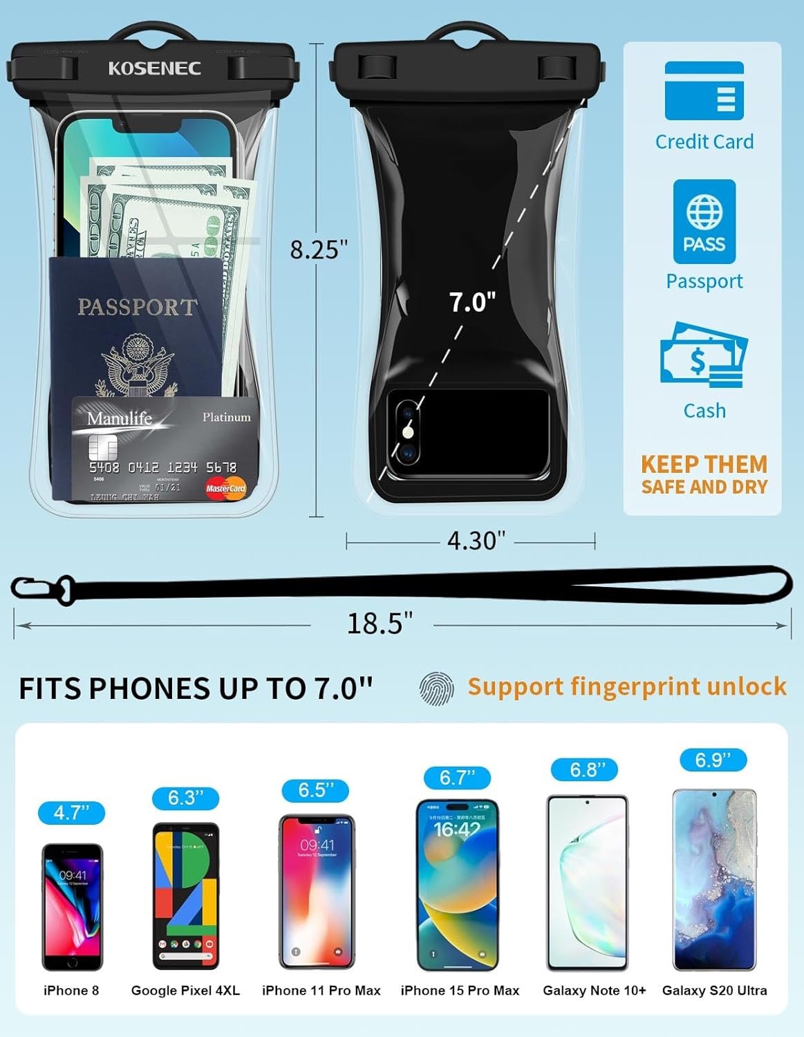 HD DISPLAY DRY BAG – High clear transparent waterproof phone case enable you to take good quality pictures and videos and checking emails underwater. Compatible with devices up to 7.0 inches, like iPhone 15 14 13 12 11 Pro Max X XR XS 8 7 6 Plus; Samsung Galaxy S10+ S9 S8, HTC, LG, Huawei P30 Pro, Mate 20 Pro, more devices and ID card, credit cards, cash, passport, etc.